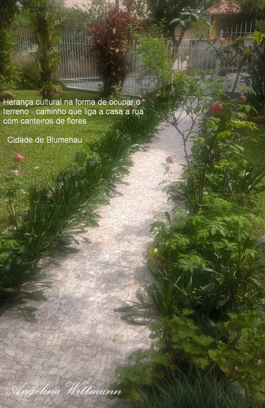 Na cidade de Blumenau, em um primeiro momento a propriedade colonial continha a residência, afastada da rua. Quase sempre munida de uma varanda (Ver croqui). A casa era ligada com a rua por um caminho ladeado por canteiros de flores. Quase sempre continham rosas, margaridas, dálias, cravos, bico e leão, jasmim, estrelícia, gérbera, antúrios...etc... Na proximidades havia a horta, a estrebaria, o local dos animais. Na parte posterior da propriedade, raramente em outra localização, mas tinha exceções, estava o rio. Elemento que propiciava acessibilidade e fornecimento de água para a plantação animais e uso doméstico.