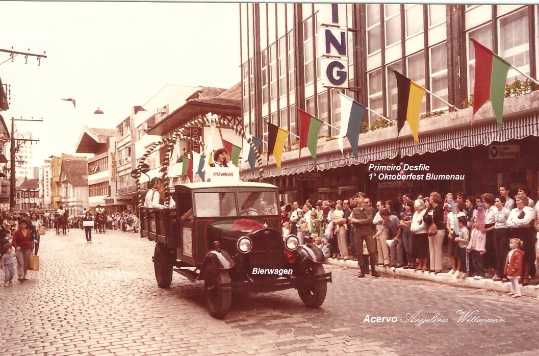 | Primeiro Desfile da primeira Oktoberfest Blumenau - o Bierwagem - do qual Herr Schmidt tocava, enquanto era distribuído chope ao público da Rua XV de Novembro. |