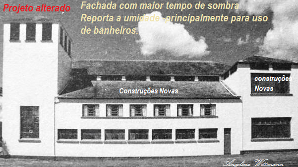 O arquiteto previu, através da "leitura" do projeto, de que se não houvessem aberturas na parte que receberia mais insolação - haveria maior conforto térmico. O projeto não foi respeitado. Foi executada parede munida de janelas, e não somente isto. Construíram janelas com arcos plenos, destoando totalmente da arquitetura original apresentada. Em breve - fotografias.