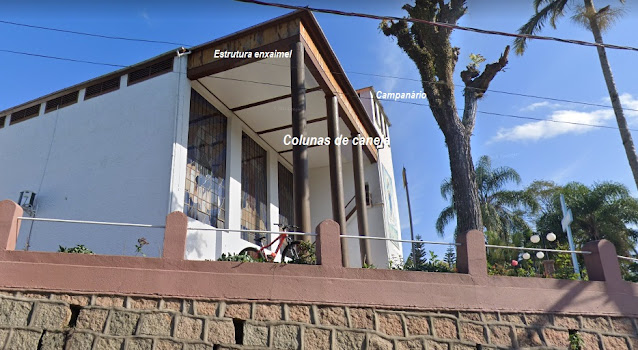 Estrutura Enxaimel revestido com Taipa A estrutura original da igreja, mesmo com um proposta moderna, talvez por falta de mão de obra, ou talvez pela proposta de alvenaria vernacular - originalmente foi construída com a técnica construtiva enxaimel e com fechamentos feitos com taipa rebocada.